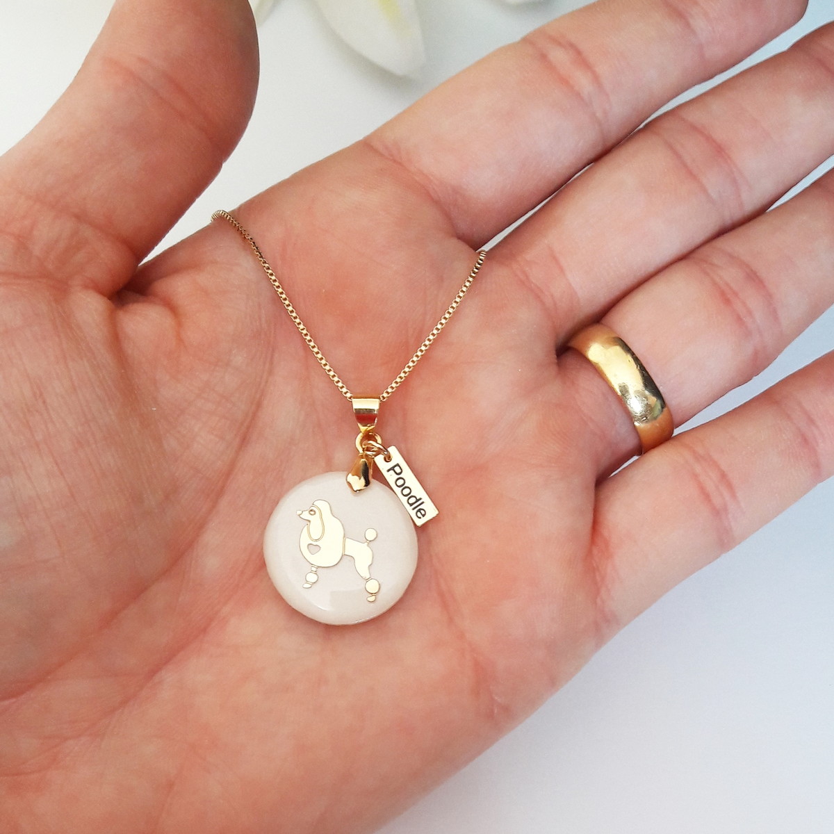 Lindo Colar Poodle da coleção Pet raças com pingente perolado e plaquinha com a raça em uma delicada corrente folheada a Ouro 18k. Semijoia perfeita para demonstrar todo seu amor pelo seu amigo de quatro patas!
