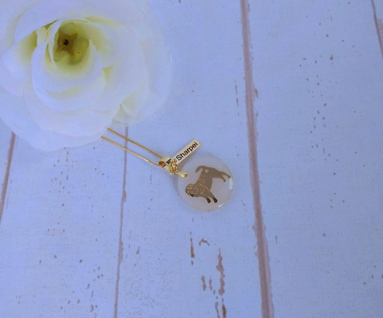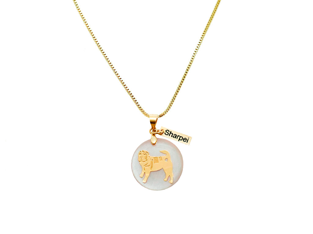 Lindo Colar Sharpei da coleção Pet raças com pingente perolado e plaquinha com a raça em uma delicada corrente folheada a Ouro 18k. Semijoia perfeita para demonstrar todo seu amor pelo seu amigo de quatro patas!