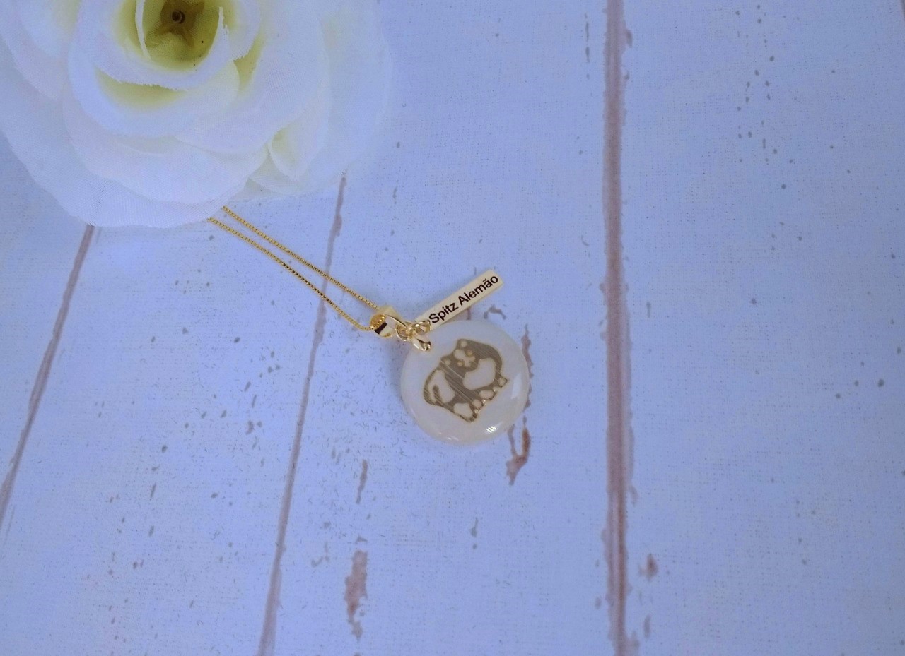 Lindo Colar Spitz Alemão (Lulu da Pomerânia) da coleçãp pet raças, com pingente perolado e plaquinha com a raça em uma delicada corrente tipo veneziana também folheada a Ouro 18k. Semijoia perfeita para demonstrar todo seu amor pelo seu amigo de quatro patas!